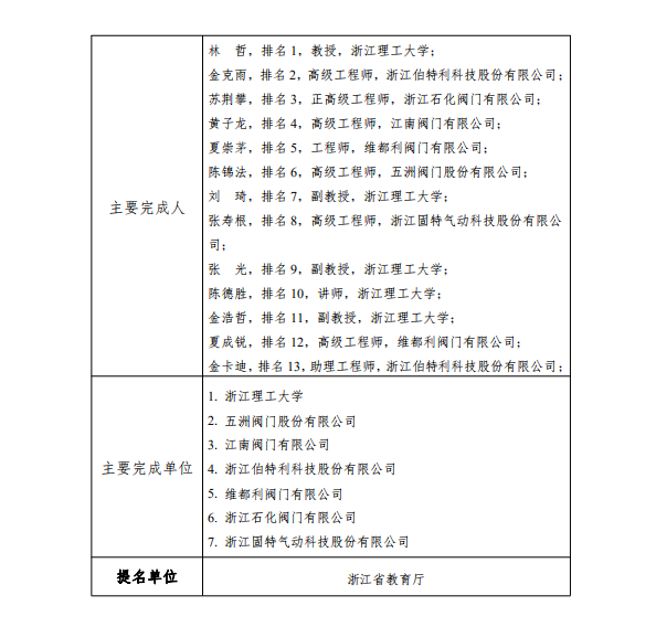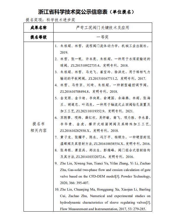 根據《浙江省科學技術廳關于開展2021年度浙江省科學技術獎提名工作的通知》要求,現對我單位擬參與申報的浙江省科技獎勵項目“嚴苛工況閥門關鍵技術及應用”予以公示,公示期7天(2022年2月26日至2022年3月4日)。